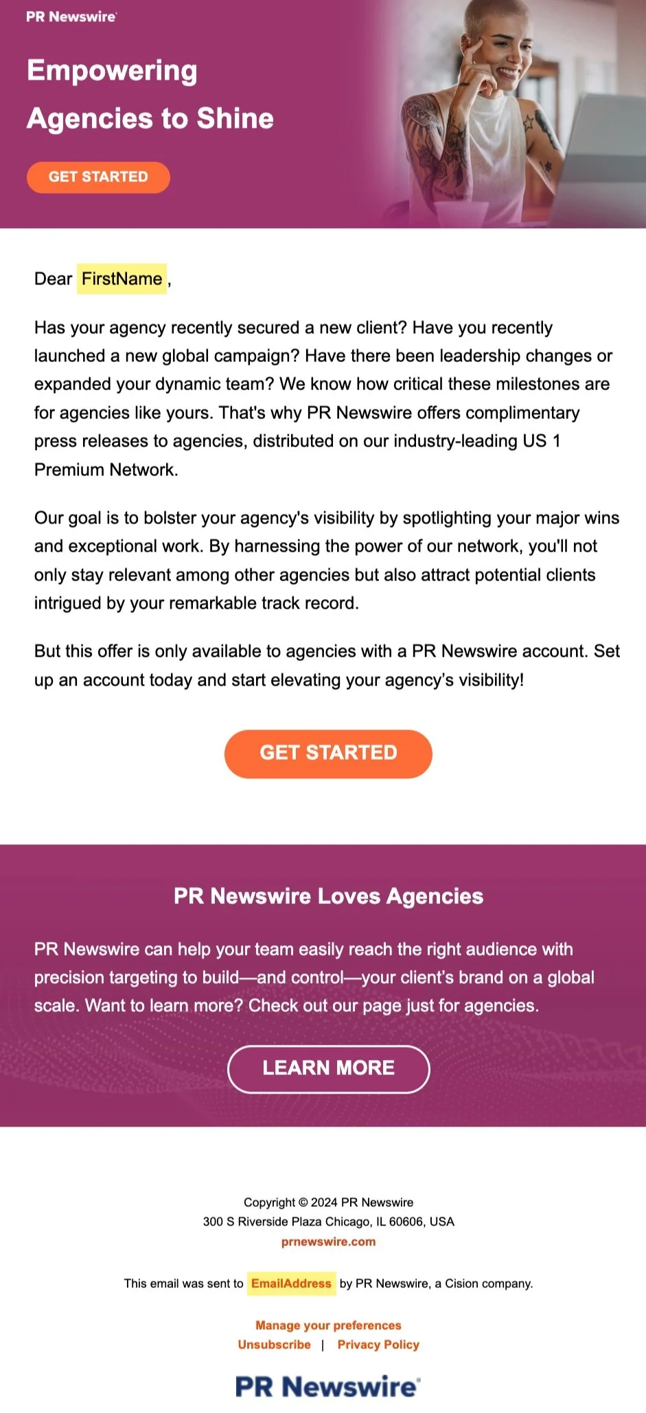 Campaign Description: This campaign features PR Newswire’s solutions specific to enterprise and SMB agencies aimed at generating net new MQLs and SQLs (Tier 1 and Tier 2 leads), renewals, and upgrades.
